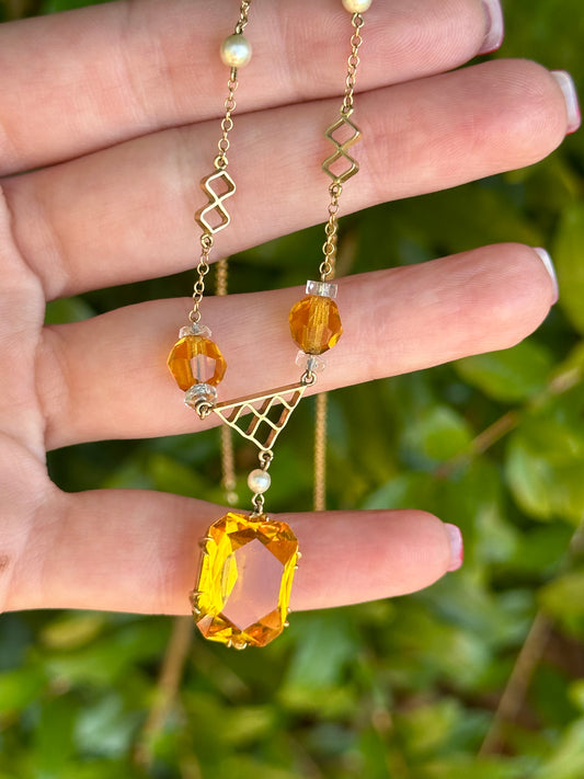 9ct Vintage and natural pearl necklace with large orange stone - 16.75”