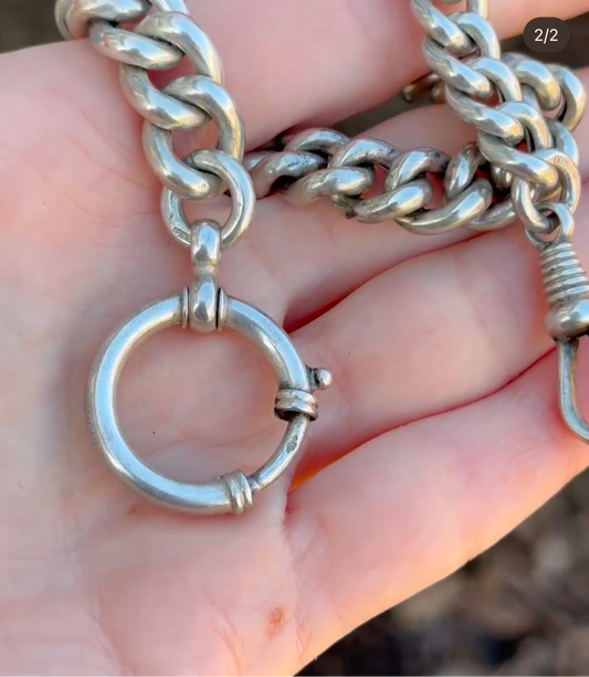 Silver chunky Antique curb watch chain with oversized bolt clasp