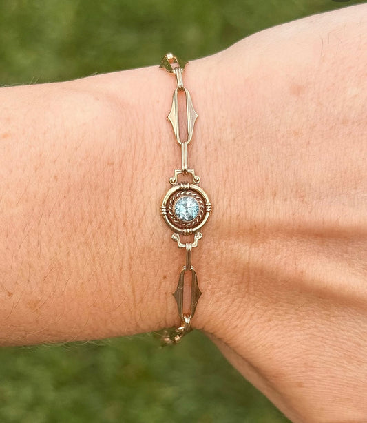 Stylized Trombone Chain 10ct Antique with Aquamarine stone - 7.75”