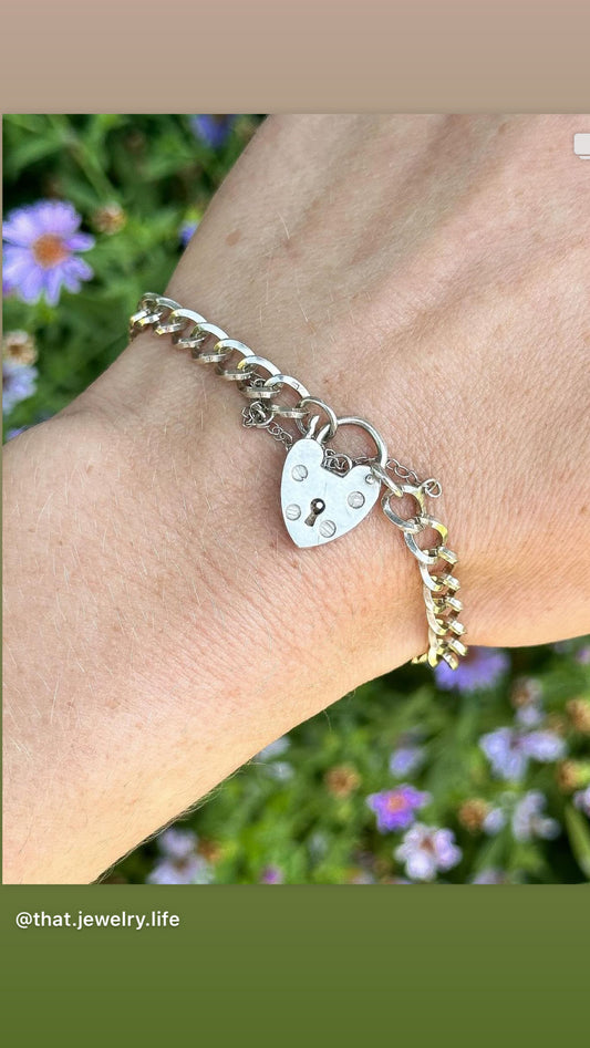Vintage Sterling Silver Heart Padlock bracelet with squared curb links - 7.5”