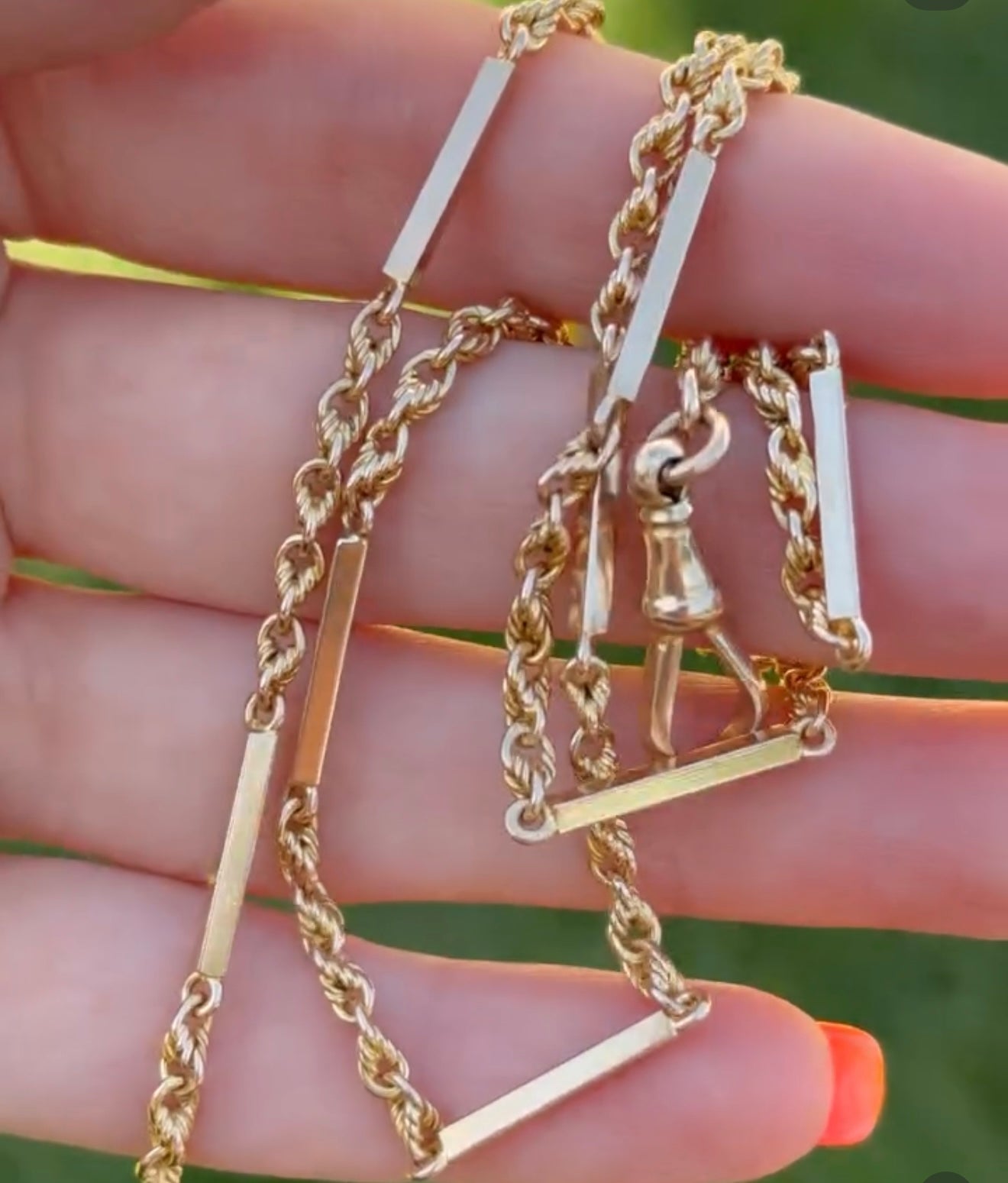 This is a *15ct* (!!!) yellow gold love-link bar link long guard (muff chain) chain with a gorgeous large dog clip.